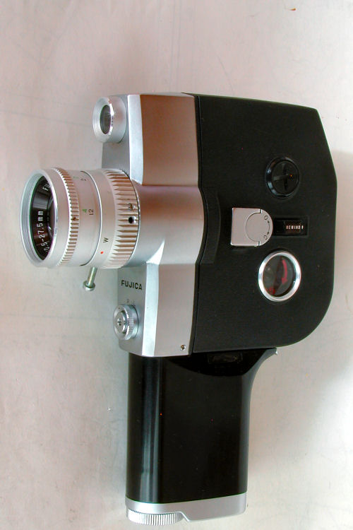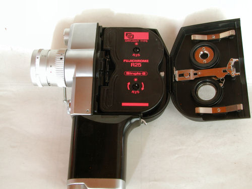 Ein Geschenk eines Foto- und Filmenthusiasten aus der Nähe. Meine zweite Kamera mit der Single-8 Kassette. Sie funktioniert tadellos, braucht allerdings zusätzlich zu den 4 Mignonzellen für den Motor noch eine PX 14 Knopfzelle für die Belichtungsautomatik. Die gibt es wegen des Qecksilbergehaltes natürlich nicht mehr und man muss nach Ersatz suchen. Neu: Meine Kamera habe ich deshalb jetzt (03.01.2015) umgebaut. Den Handgriff mit den Batteriefächern abgebaut, die Kabel von der Knopfzelle dort abgenommen und Masse mit der Masse von den 4 Mignonzellen zusammen gelötet. Das Pluskabel von der Knopfzelle mit der Brücke oben im Batteriefach verlötet. Dort stehen 2,4 Volt an und das entspricht fast der Nennspannung der alten PX 14 Batterie. Auf die Idee dazu hat mich meine Beaulieu 4008 ZM II gebracht. Die läuft mit 7,2 Volt, der Belichtungsmesser dagegen mit 3,6 Volt. Beide Spannungen auch hier aus einem Batteriepack. Da wohl der Minuskontakt am "Lock"schalter unterbrochen wird, schaltet sich auch für den Belichtungsmesser der Strom mit ab. Was will man mehr! |