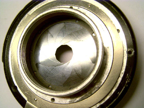 -1- Noch einmal der Verschluss. Ich habe es seinerzeit nicht gewagt, die 10 Blendenlamellen auszubauen. Weil sie aber immer stärker aneinander backten, habe ich es nun getan. Links auf dem Foto die Verschlussrückseite mit dem Blendenmechanismus. Nach Herausdrehen der 3 Schlitzschrauben hat man die Lamellen frei.