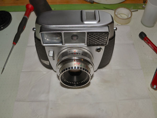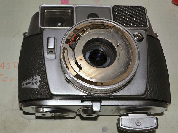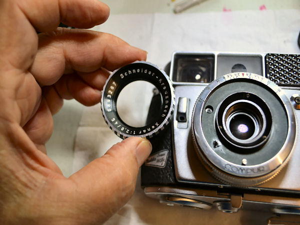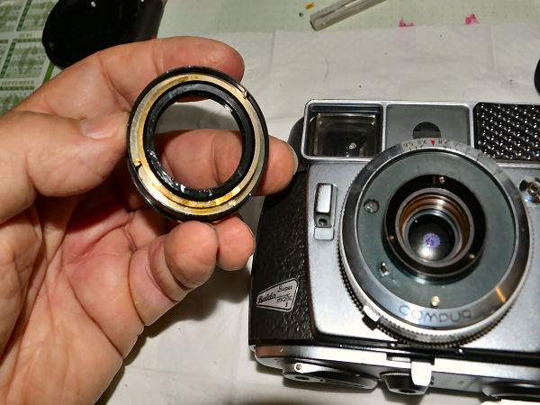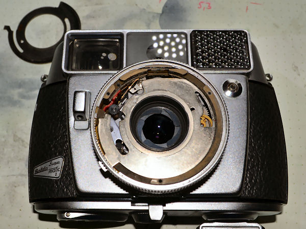 Die Balda Super Matic oder auch Super Balda Matic hat den Compur Verschluß für automatische Kameras, bei dem nach freier, stufenloser Zeitvorwahl von 1/30, 1/60, 1/125, 1/250 bis 1/500 Sek. die mit dem Belichtungsmesser gekuppelte Automatik die zugehörige Blende festlegt. Die Automatik ist abschaltbar, die Einstellung der Zeit- und Blendenwerte kann für B und Blitzaufnahmen auch von Hand vorgenommen werden. Filmempfindlichkeiten von 10 bis 1250 ASA oder von 12 bis 30 DIN werden auf die entsprechende Zahl am Verschluß eingestellt und vom Verschluß über den gesamten Einstellbereich selbsttätig berücksichtigt. Diese Kamera sieht immer noch aus wie neu und der Selenbelichtungsmesser, der ja hier die Automatik steuert, funktioniert tadellos. Ich besitze sie seit 2010 und sie funktionierte damals. Das hat sich leider geändert, nun schließt der Verschluss nicht mehr. Ich möchte versuchen, sie zu reparieren. Etwas Mut macht mir die Tatsache, dass ich an meiner Kodak Retina Automatic III den gleichen Verschluss habe. Und auch die Kamera funktioniert heute immer noch. Dazu liegen 2 weitere Retina Exemplare im Karton, die ich jetzt als Anschauungsmaterial nutzen kann. Im großen Compur Repair Manual ist dieser Verschluss nicht weiter beschrieben. Es gab dafür ein Extraheft und das habe ich bislang nicht gefunden. Es geht also los: Mit einem Gummisauger wird der Innenring um die Frontlinse herausgedreht. |