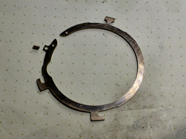 Hier sieht man den Fokussierring von der Unterseite mit der Führung für den Abtaststift des Entfernungsmessers. Den Chromring mit dem Schriftzug Compur und der Tiefenschärfenskala motiert man als nächstes ab. Vorsicht: winzige, sehr kurze Madenschrauben! Ist der Ring ab, sieht man 3 Schlitzschrauben. Auch die herausdrehne und dann die Platte mit Front und Mittellinse abheben. |