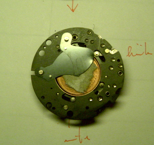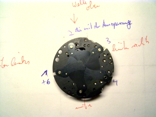 Noch einmal zurück zum recht seltenen Verschluss der Compur Werke München. Es handelt sich um den Spezial Verschluss CN-1110-030. Nur in der Super Colorette und in der Vitessa T verbaut. Er besitzt 6 Verschlusslamellen, davon 4 identische und zwei anders geformte Lamellen. Die Reihenfolge des Einbaus ist vorgeschrieben. Damit es klappt und die Lamellen nicht nach unten fallen, habe ich in den Tubus 4 5-Cent Münzen übereinander gelegt und darauf ein Stück dünne Pappe. Eine der vier gleichen Lamellen kommt an Platz 1, zu erkennen an der eckigen Ausfräsung der Verschlussplatte. (Hier links auf der Abbildung bei 9 Uhr.) Die zweite Lamelle ist die mit der schärferen Ecke. Diese Ecke sitzt bei geöffnetem Verschluss unmittelbar an der Spannwelle des Verschlusses. Die Spannwelle ist die Achse, die über den Filmtransportvorgang des Fotoapparates den Verschluss wieder für die nächste Aufnahme spannt. An diese Stelle passt nur diese Lamelle Nr. 2. Die Führungsbuchse für die Spannwelle ist oben auf der Abbildung zu erkennen, genau rechts neben der dafür besonders geformten Lamelle Nr. 2. | ||||||||||||||||||