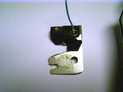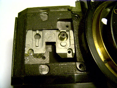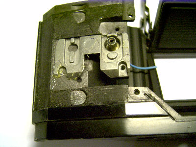 Links das schon fertig zurecht gefräste Bauteil für den zusätzlichen Kontakt. PUK-Säge, Dremel und Bandschleifer waren behilflich. Beim Modell "S" führt ein blaues Kabel zum Blitzkontakt. Man müßte erkennen, daß das bearbeitete Stück aus einem, wie dem darüber abgebildeten Original-Bauteil heraus gesägt und geschliffen wurde.