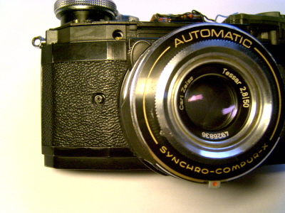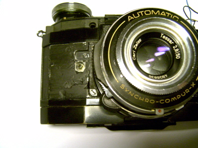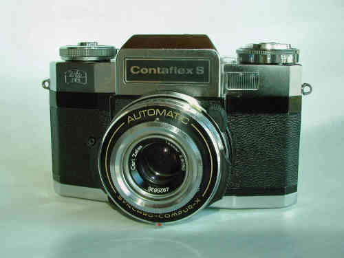 Wer sich gut auskennt, wird merken, daß das obere Gehäuse nicht von einer Contaflex S stammt. Ich habe das Typenschild ausgetauscht. Der eingeprägte Name "Zeiss Ikon" links vorn an dem oberen Gehäuse ist von einer super BC. Die Contaflex S hatte da ein angeklebtes Schildchen mit dem Namen "Zeiss Ikon Voigtländer".