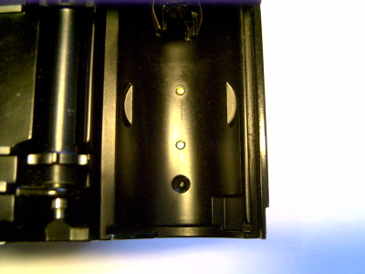 Das andere Stück auf den Batteriehalter geklebt und dann im Gehäuse angebracht. Man könnte es jetzt noch mit mattem Lack schwärzen, damit nichts reflektiert. Oder ein Stück schwarzes Isolierband von oben auf den Batteriehalter kleben. Damit sollte auch dieses Langzeitprojekt beendet sein.