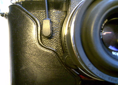 Noch ein Foto, hier mit angesetzter Objektivträgerplatte. Nach Verfüllen der Lücken wird wieder eine dünne Pappe darüber geklebt und anschließend eine neue Belederung. Es wird nur ein kleines Loch im Leder mit der Buchse zu sehen sein. Auch mit Bereitschaftstasche wird der Kontakt zugänglich sein.