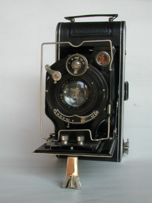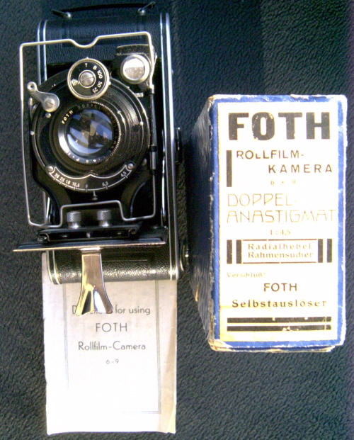 Dies ist die wohl älteste Kamera meiner Sammlung. Hergestellt 1930 - 1933 von der Firma Foth aus Berlin, die es leider lange nicht mehr gibt. Ein Link zu Flickr zeigt das amerikanische Verkaufsprosspekt dazu. Selbst in Danzig hat die Firma einmal Ferngläser hergestellt. Auch hier führt dieser Link zu weiteren Informationen bei Flickr. Andere Apparate aus diesem Hause hießen Derby oder Foth Flex, letztere war eine zweiäugige Kamera, sogar mit Schlitzverschluss. Die Bedienungsanleitung stammt von 1933, ansich kein gutes Jahr, trotzdem ist die Kamera gelungen und auch heute noch technisch einwandfrei. Der Verschluss ist meines Wissens aus dem Hause Deckel und heißt Compound. Dieses Modell ist eine echte Laufbodenkamera ähnlich der Voigtländer Bessa II. Das Foth-Objektiv besteht vor dem Verschluss und hinter dem Verschluss aus baugleichen Linsenpaaren, daher der Name "Doppel" - Anastigmat. Ausgestattet ist sie weiterhin mit drei Suchern, ein recht einfacher, ausklappbarer Rahmensucher am Gehäuse, dem Radialhebel Rahmensucher und dem drehbaren Brilliantsucher am Objektiv. Wer dreimal suche(r)t - der wird finden. |