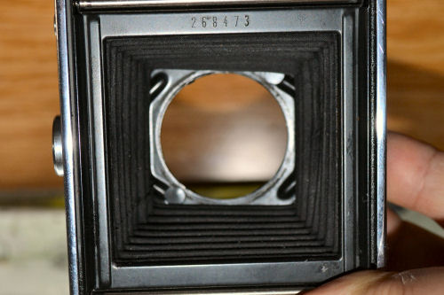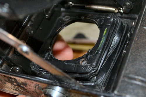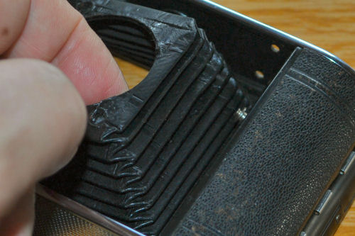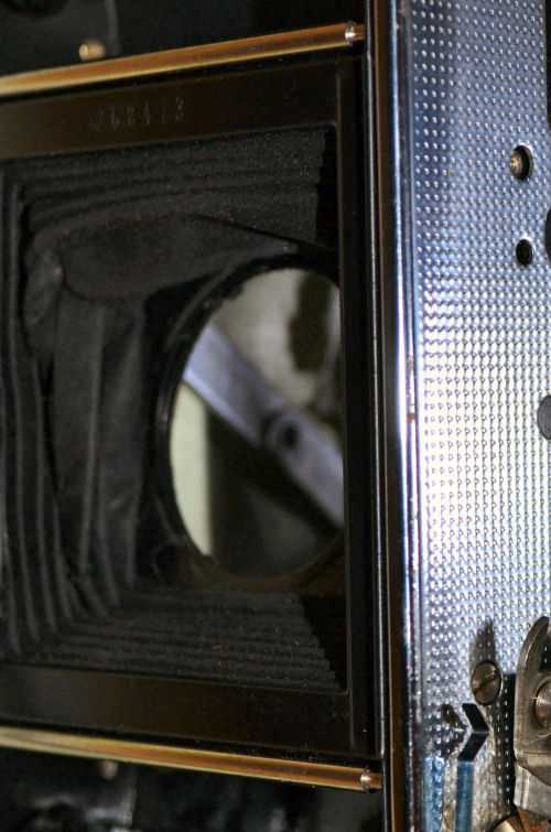 Für solche Arbeiten ist es dann doch schon erforderlich, die Spannung aus dem Balgen zu nehmen, also den Verschluss zu entnehmen. Hier musste ich an der Standarte noch 3 Haken lösen, damit sich der Balgen bei geöffneter Klappe zusammenziehen kann. Obwohl sehr viele Teile fest vernietet sind, konnte man die Klappe wenigstens an der Scharnierseite abschrauben und dann an die andere Seite legen. Dazu sind oben und unten 2 Schlitzschrauben heraus zu drehen, unten findet man sie hinter dem Kunstleder, das muß dafür ab und dann neu verklebt werden. Auf dem Bild ist der Balgen schon "entknittert". | ||||||||||||||||||||