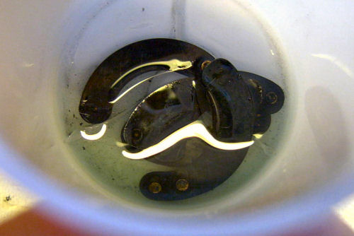Da sind die 8 verrosteten Lamellen. Die sollte man nun erst einmal in ein Waschbenzinbad legen und dann mit einem Papiertuch säubern und trocknen.