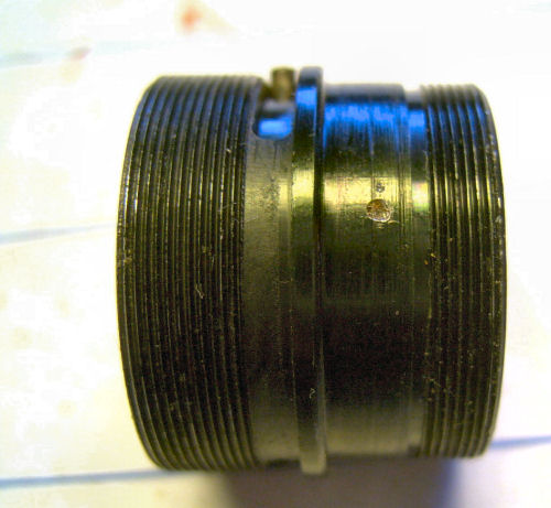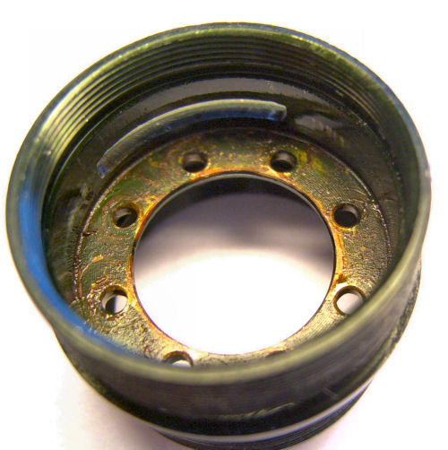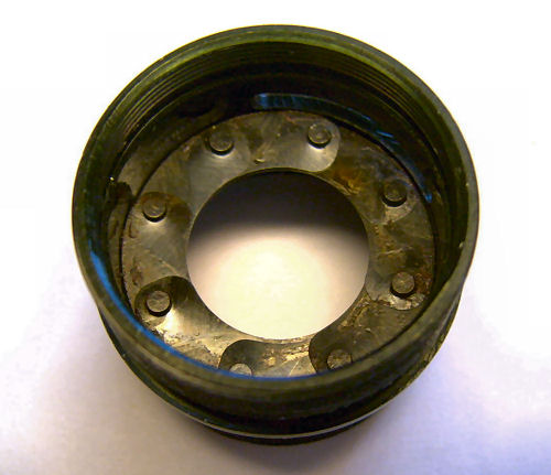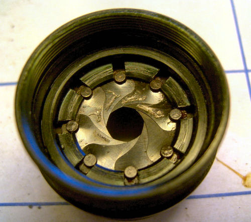 Die Abbildung zeigt nun den entnommen Korb. Links zeigt nach vorn, rechts zur Kamera. Der Leichtmetallring mit den zwei Schlitzen muss abgedreht werden, dazu muss zunächst die Schraube mit dem längeren Kopf herausgeschraubt werden, ansonsten kann man den Ring nicht nach vorn abschrauben. In diesem Gewinde sollte etwas zähes Fett zu erkennen sein (auf der Abbildung schon entfernt). Wenn man das nicht besitzt für den Wiederzusammenbau, sollte man es nicht abwischen und erst einmal das alte Fett dort belassen. Optimal ist natürlich das Säubern und Verwenden neuen Spezialfettes. Das zähe fett sorgt dafür, daß die Blende sich nicht zu leicht verstellen läßt. Es gibt da keine Raste oder ähnliches.