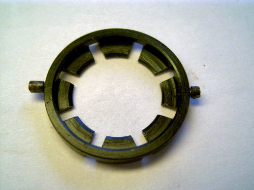 Achten sie auf die zwei Seitenschlitze des Korbs. Ausgehend davon, daß die Blende so wie sie sich jetzt zeigt, eingestellt ist auf voll geöffnet (Blende 3,5) und der Tatsache daß man im Uhrzeigersinn die Blende durch Drehen schließt, muß der abgebildete Ring dementsprechend in den Korb gelegt werden und die oberen Achswellen der Lamellen müssen in die Aussparungen eingreifen.