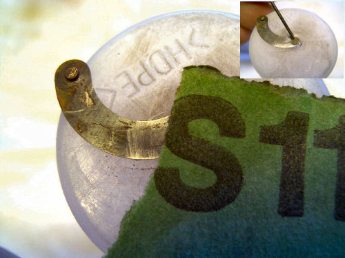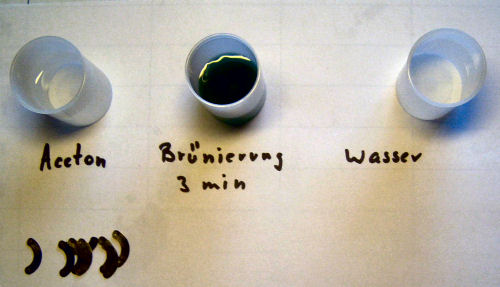 Das Bild zeigt 3 Gefäße (Kleinbildfilmdosen). Man benötigt eine saubere Pinzette, greift damit die Lamelle an einer Achse und beginnt von links wie abgebildet mit einem Acetonbad zum Entfetten, trocknet die Lamelle wieder auf einem Papiertuch und taucht sie dann in die Brünierung. Die Lamelle wird daraufhin sehr schnell schwarz. Lassen Sie sie nicht ins Gefäß fallen, wenn dann etwas dazwischen kommt und sie dort vergessen wird, ist sie nach längerer Zeit in der Flüssigkeit "aufgefressen". Es ist auf alle Fälle eine saure Mischung, die das Metall angreift.