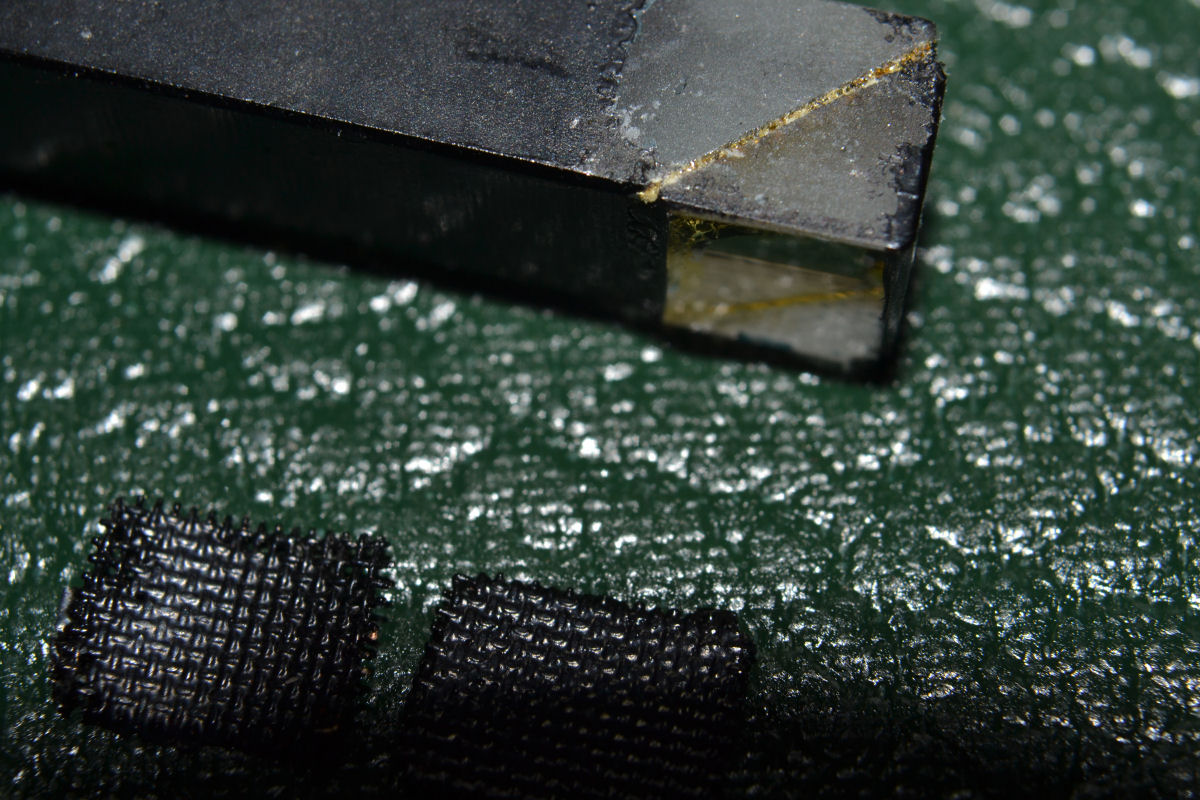 Das linke Bild zeigt den Defekt sehr deutlich. Nur bei guten Lichtverhältnissen war der Entfernungsmesser noch zu gebrauchen. Die beiden "Pflaster" sind die Unterlagen, das ist also die Unterseite des Prismas. |