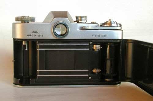 Die Rückwand läßt sich schon aufklappen, die Vorgängermodelle hatten da noch andere Lösungen.Ulrich Witte aus Hamburg ist großer Kenner und Sammler dieser russischen Kameras. Ein Besuch seiner Homepage ist immer lohnenswert. Ebenso sollten sie zu Guido Studer aus der Schweiz schauen. | ||||||||||||||