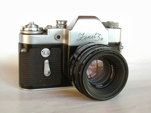 Es gab auch diverse Objektive für die Zenit 3 M, heute aber schwer zu finden. Z.B das Weitwinkel "Mir-1" (1:2,8/37 mm), oder das Porträt-Tele "Jupiter 9" (1:2,0/85 mm), oder das lichtstarke Porträt-Tele "Helios 40" (1:1,5/85 mm), oder das Tele "Tair-11" (1:2,8/133 mm), oder das Tele "Jupiter 11" (1:4,0/135 mm), oder das Tele "Industar 24 M" (1:3,5/105 mm), oder das Tele "Jupiter-6" (1:2,8/180 mm), oder das Tele "Telemar-22" (1:5,6/200 mm). Dazu kamen dann noch Objektive für die umgelabelte 3M vom Fotohaus Quelle, die Revueflex. Der Verschluss verfügt über keine langen Zeiten, wie auch der meiner FED 2. Damit kann man leben, zum Blitzen muss die Kamera mit 1/30 sek verwendet werden. | ||||||||||||||